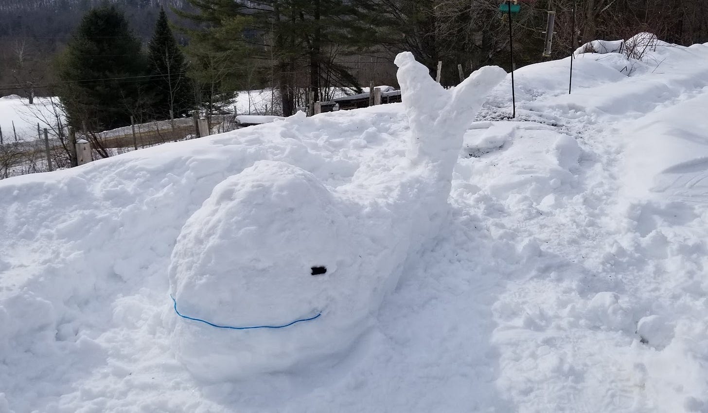 The snow softens in a brief mid-January thaw. I remember the day 5 years ago when Susan and I—provoked by a similar thaw—built a sculpture on the lawn. We boldly declared it to be a Beluga whale. As we rolled large snow-balls and sculpted our rough artwork with garden trowels, we unexpectedly began to feel we were summoning the spirit of Beluga—inviting it to join us in Vermont. As though the Beluga clan began to feel our welcome, share the humor of our clumsy, affectionate creation. It was a strangely gentle and powerful experience—opening our hearts to the cold north ice and waters, these amazing creatures, deepening our affection for and connection with our vulnerable Earth.